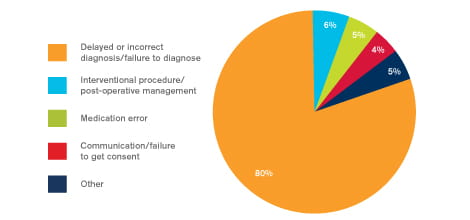 The most common condition involved in delayed diagnosis claims was cancer, which accounted for about a quarter of cases. Other conditions commonly resulting in a claim being made were fractures and cauda equina syndrome.